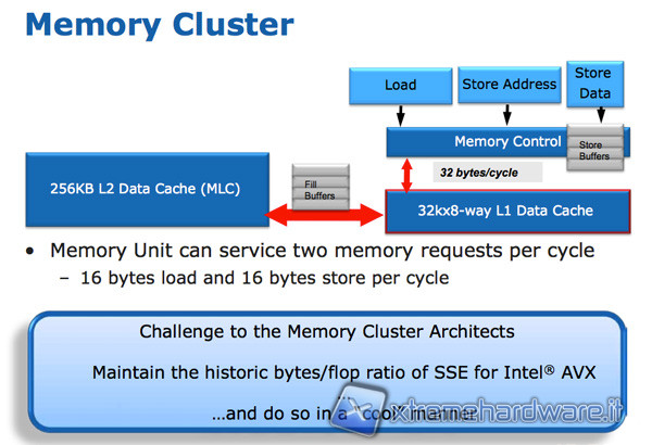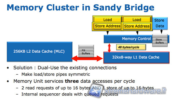 Per bilanciare la maggiore potenza computazionale in Floating Point, le CPU Sandy Bridge necessitano di un accesso alla memoria più efficiente. Anche questa volta Intel sfrutta l’architettura preesistente che prevede tre porte di tipo Load/Store: Load, Store Address e Store Data. Con un design simmetrico delle porte Load e Store Address, che sono ora in grado di compiere entrambe le operazioni, è possibile caricare il doppio di dati per ciclo di clock.